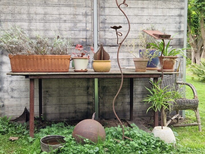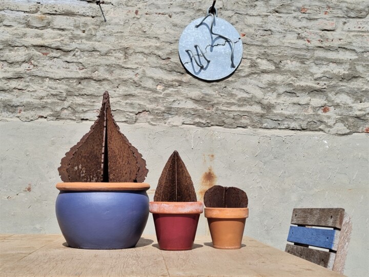 Pictures of garden decorative handmade iron pumpkins, lucky clovers, frames..., handmade by Robert van den Herik, designer and surrealist painter, who also designed iron garden decoration.